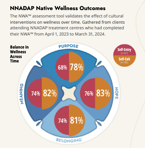 Results of assessments from 2023-2024 indicate an improvement in self-reported Hope, Belonging, Meaning, and Purpose upon exiting the treatment program (Figure 1). Success according to the NWA™ should be considered at the individual and centre levels. The data can help inform how cultural interventions support wellness, identify areas where interventions need improvement, highlight how individuals could be further supported, guide program and organizational planning, and establish a baseline for individuals, etc. The data from AMIS and other surveys, e.g., First Nations Opioid and Methamphetamine Survey, inform Thunderbird’s strategic priorities, advocacy efforts, and policies.